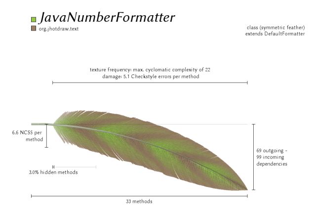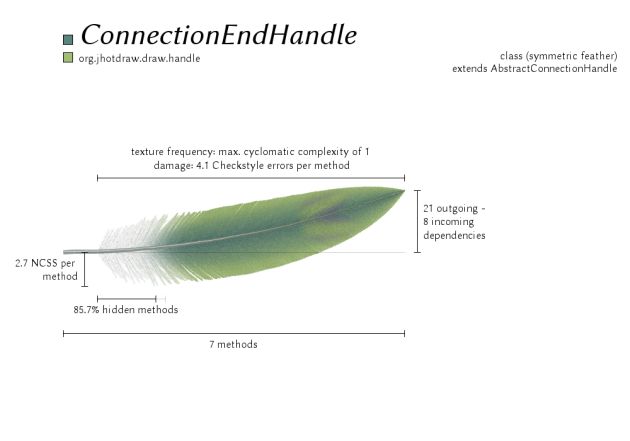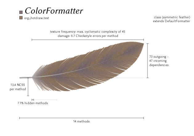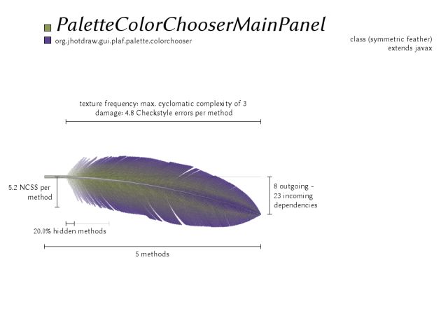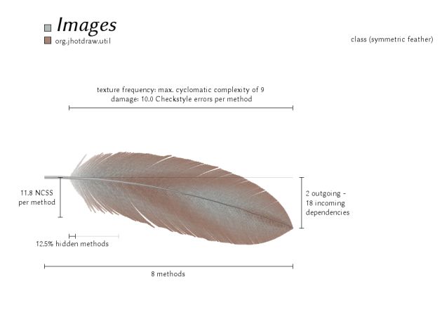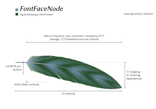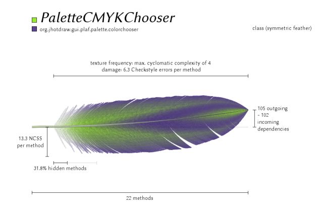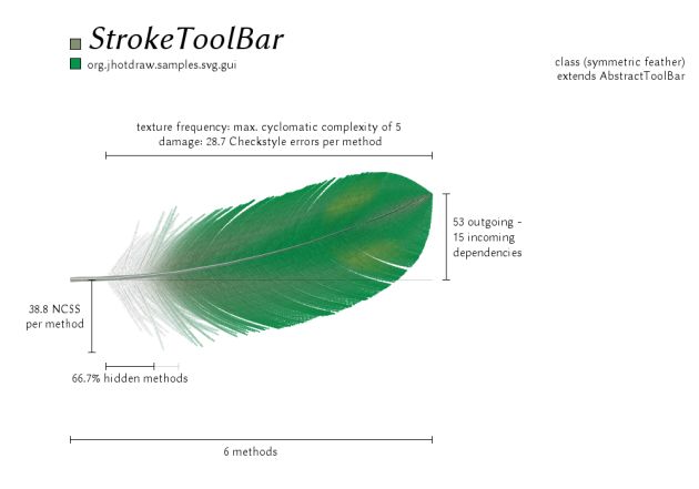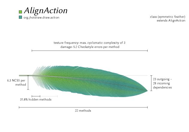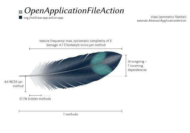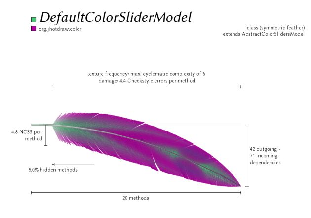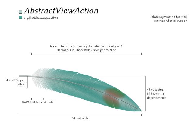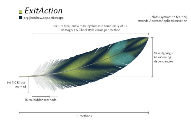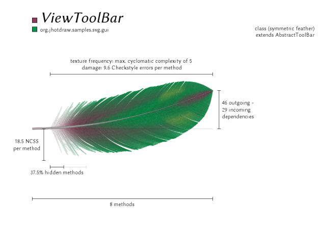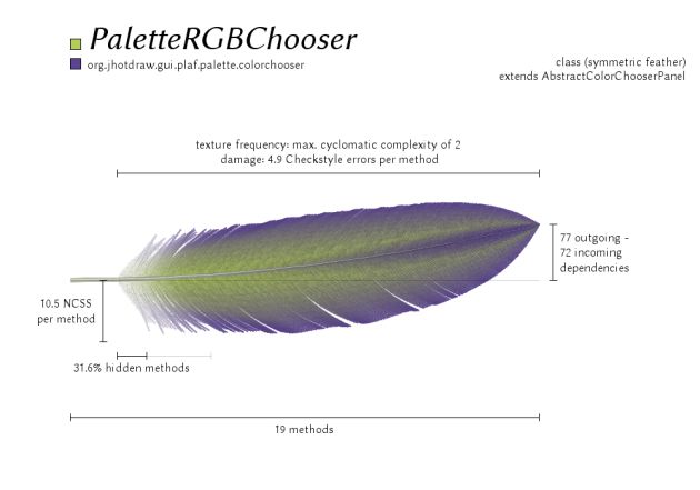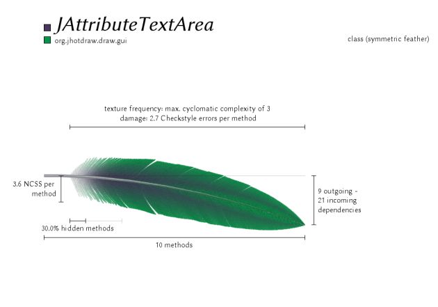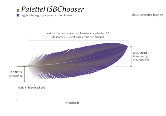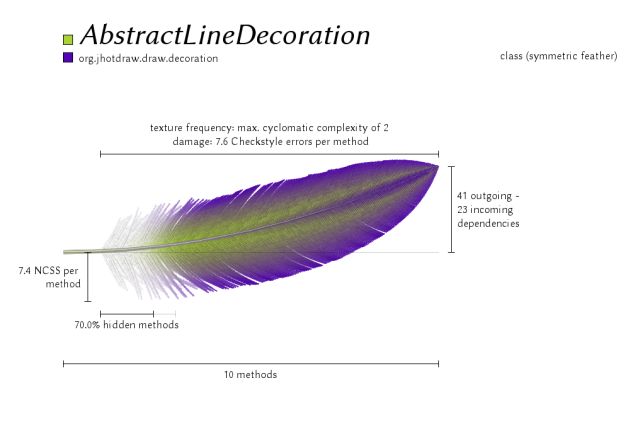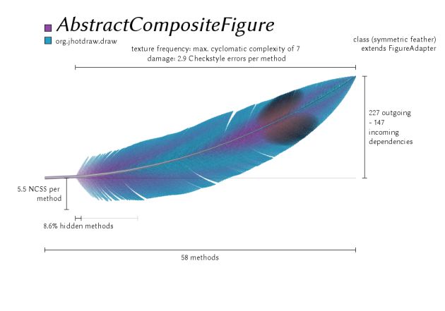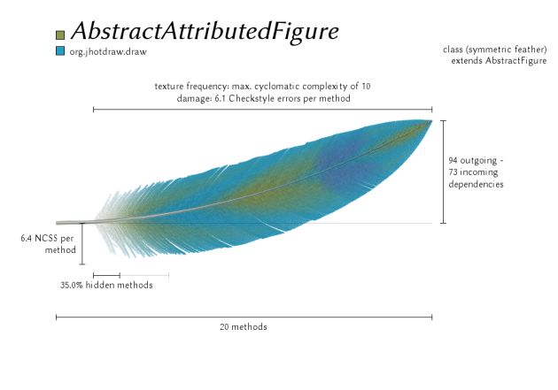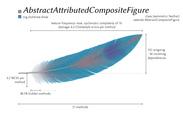 Beck, Fabian. Software Feathers: Figurative Visualization of Software Metrics. In IVAPP '14 Proceedings of the 5th International Conference on Information Visualization Theory and Applications. 2014 (to appear).